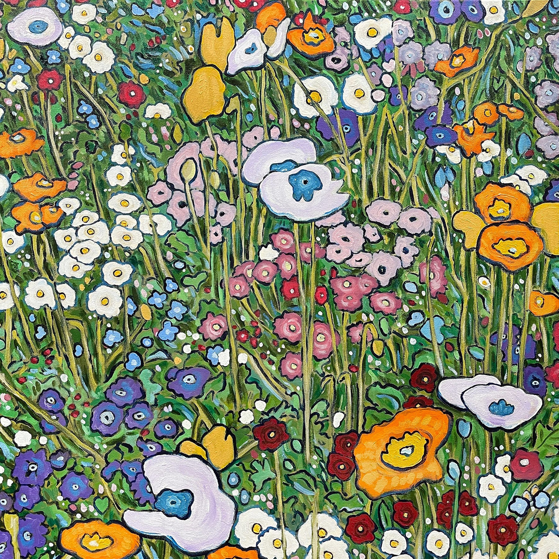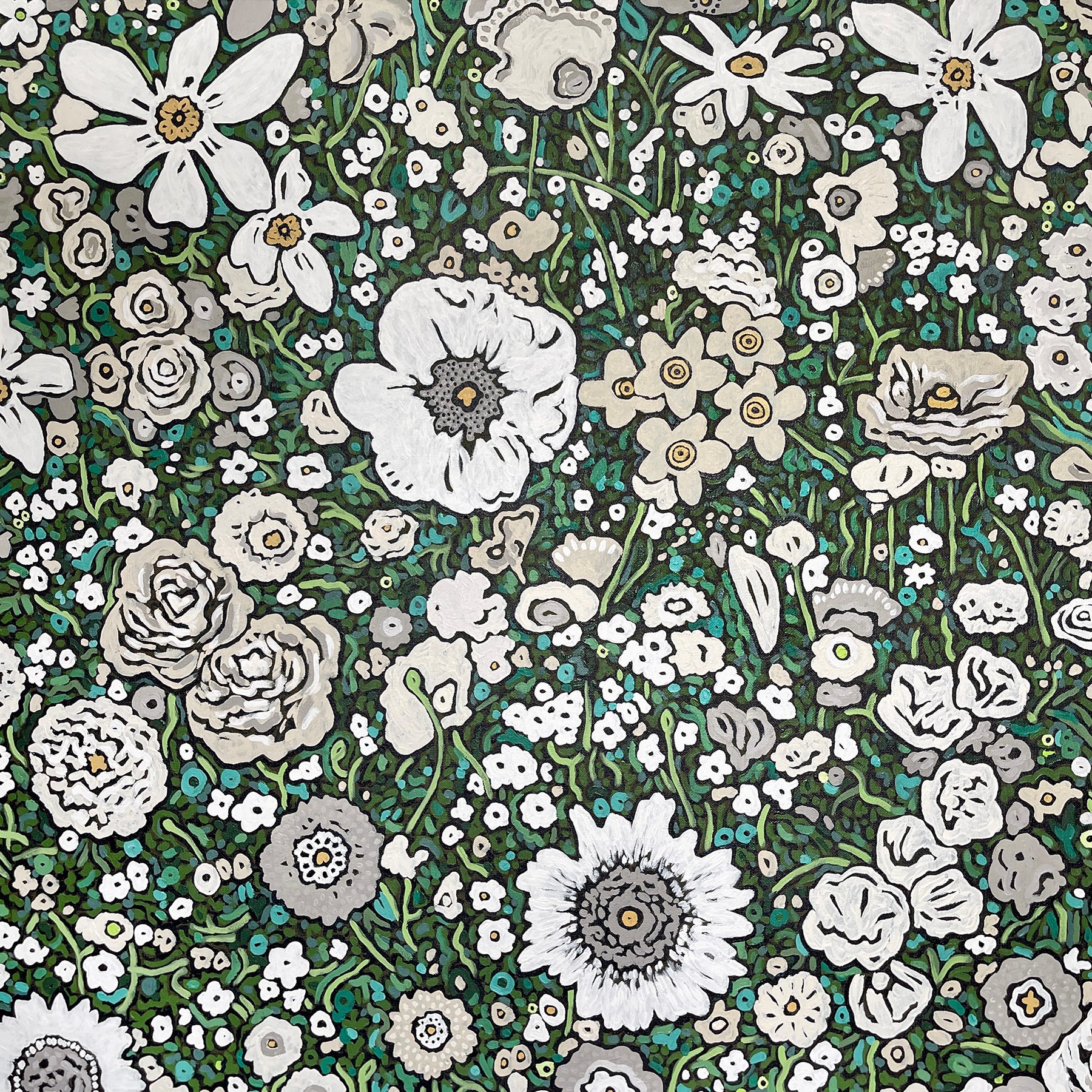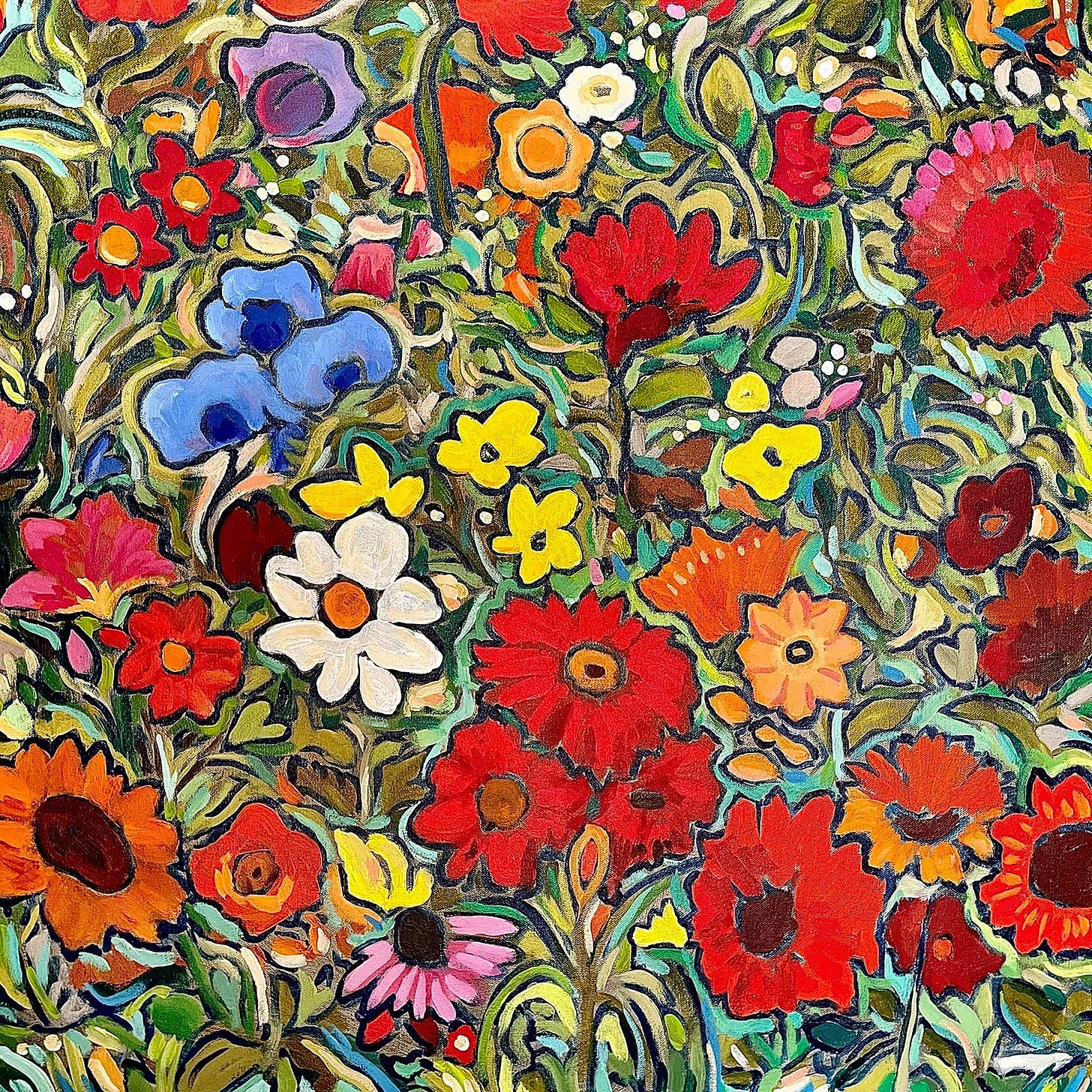 When I first saw Chris Arnold’s work, I was struck by the boldness of the graphic design of the plants and flowers within his paintings. The flowers and vegetation, expressed in different hues of viridian, sap green, and a rainbow of ochres, ultramarine, cadmiums and pinks, were packed together in pattern-like expression. In this way, his work mirrors nature; the feeling of looking out over a garden and seeing the first impression of the beauty of the flowers, then zooming in and realizing that there is also a world of beauty and detail within each flower… evenly spread out over the entire garden, multiplying endlessly. This feeling of the patterns of nature repeating in not-quite perfect replication is exactly how I feel when I look at Arnold’s work: an almost scientific celebration of the design of nature, expressed in paint. And I was able to see the work firsthand when we exhibited one of his pieces in our group show Gardens of Enchantment at the Hamptons Fine Art Fair this summer.
